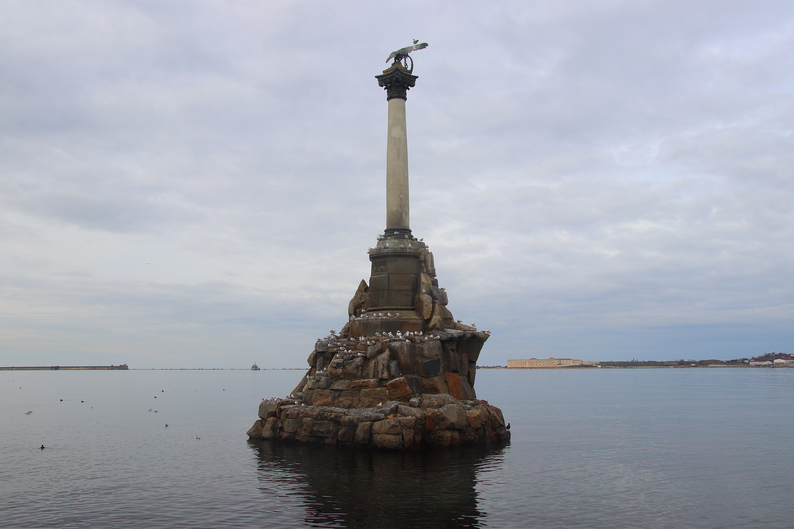 Памятник затопленным кораблям и набережная Севастополя в пасмурную погоду