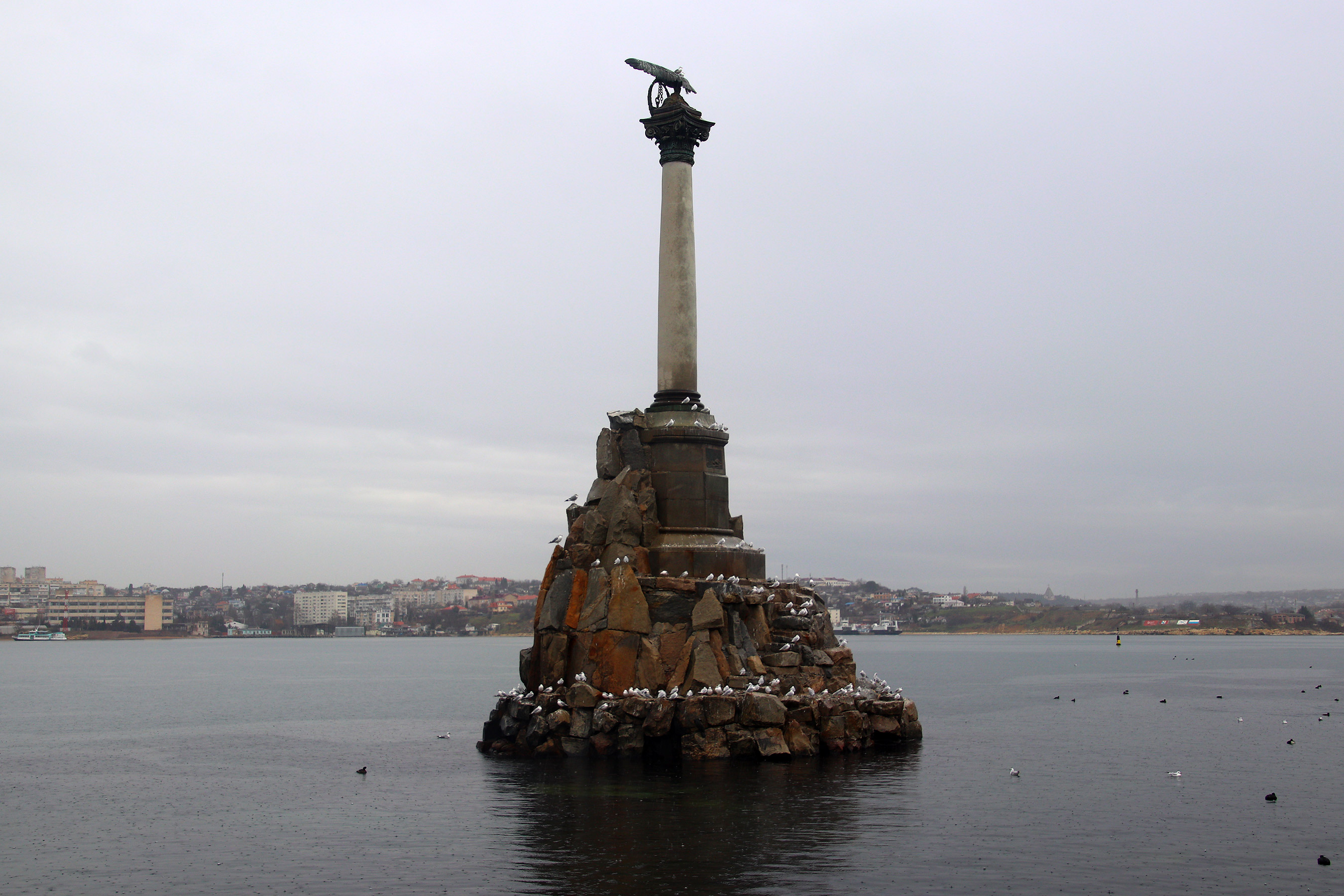 Памятник затопленным кораблям в январскую пасмурную погоду
