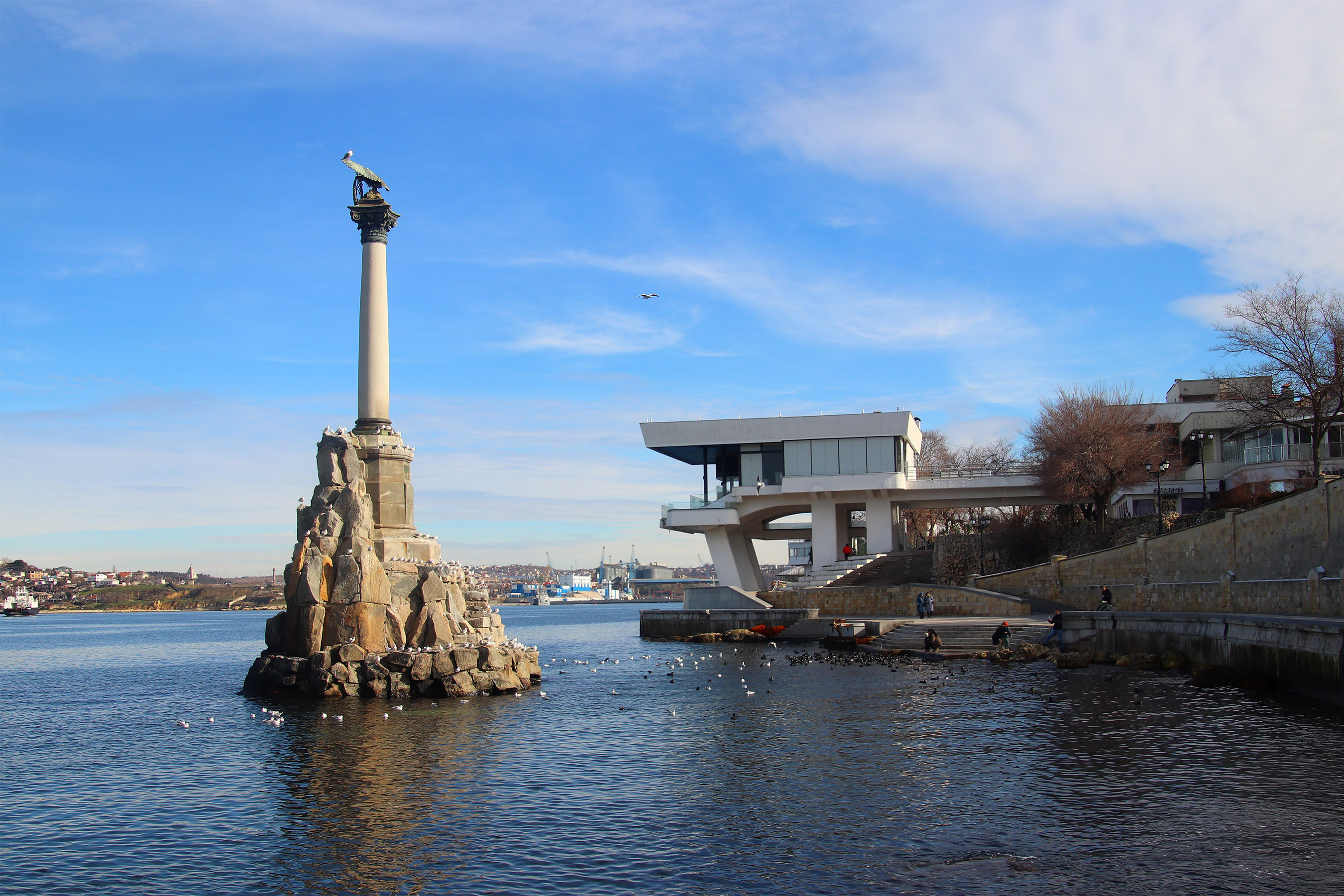 Памятник затопленным кораблям и набережная Севастополя в погожий февральский день