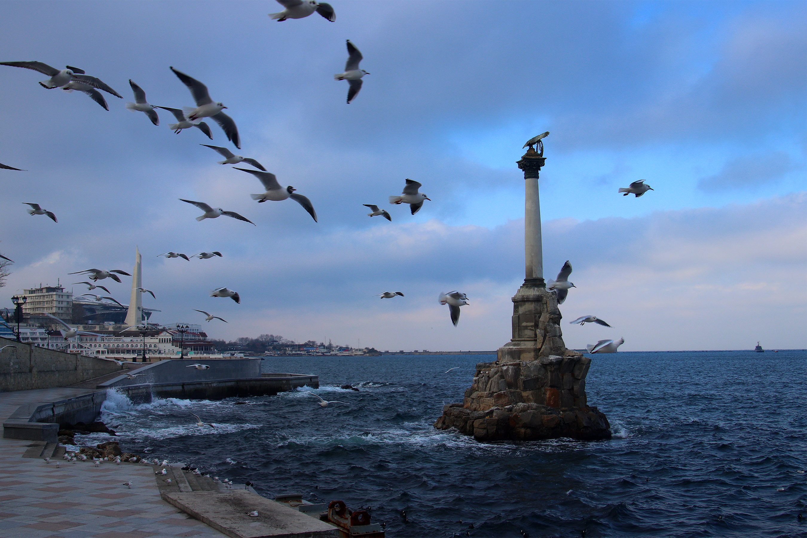 Памятник затопленным кораблям в пасмурную ветренную погоду и пролетающие мимо него черноморские чайки