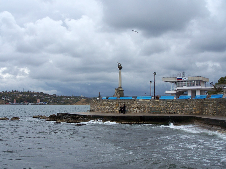 Набережная Приморского бульвара, небольшой прибой и Памятник затопленным кораблям