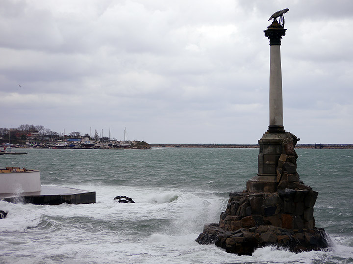 Памятник затопленным кораблям и накат штормовых волн в бухте Севастополя