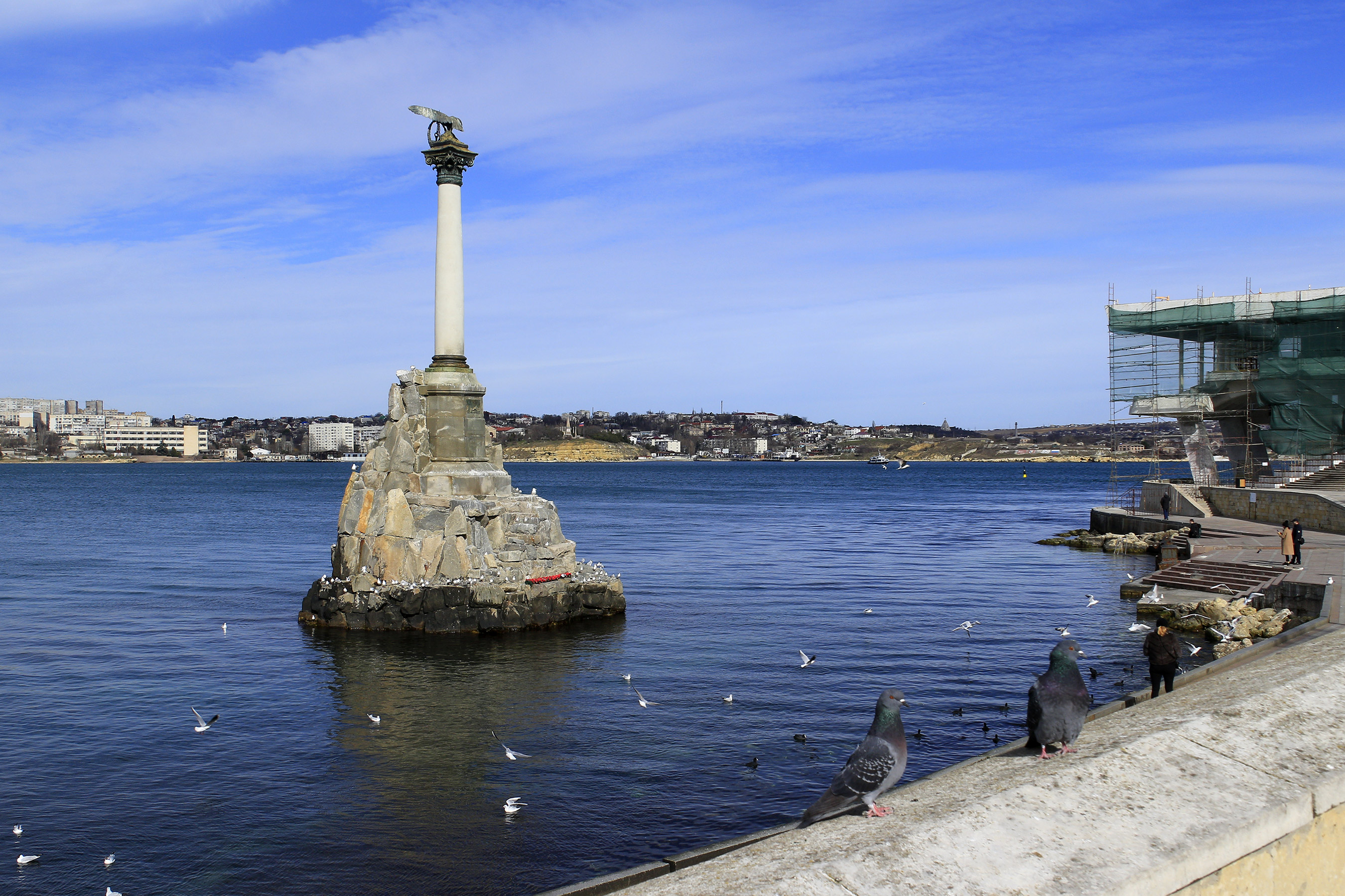 Памятник затопленным кораблям и голуби, сидящие на парапете
