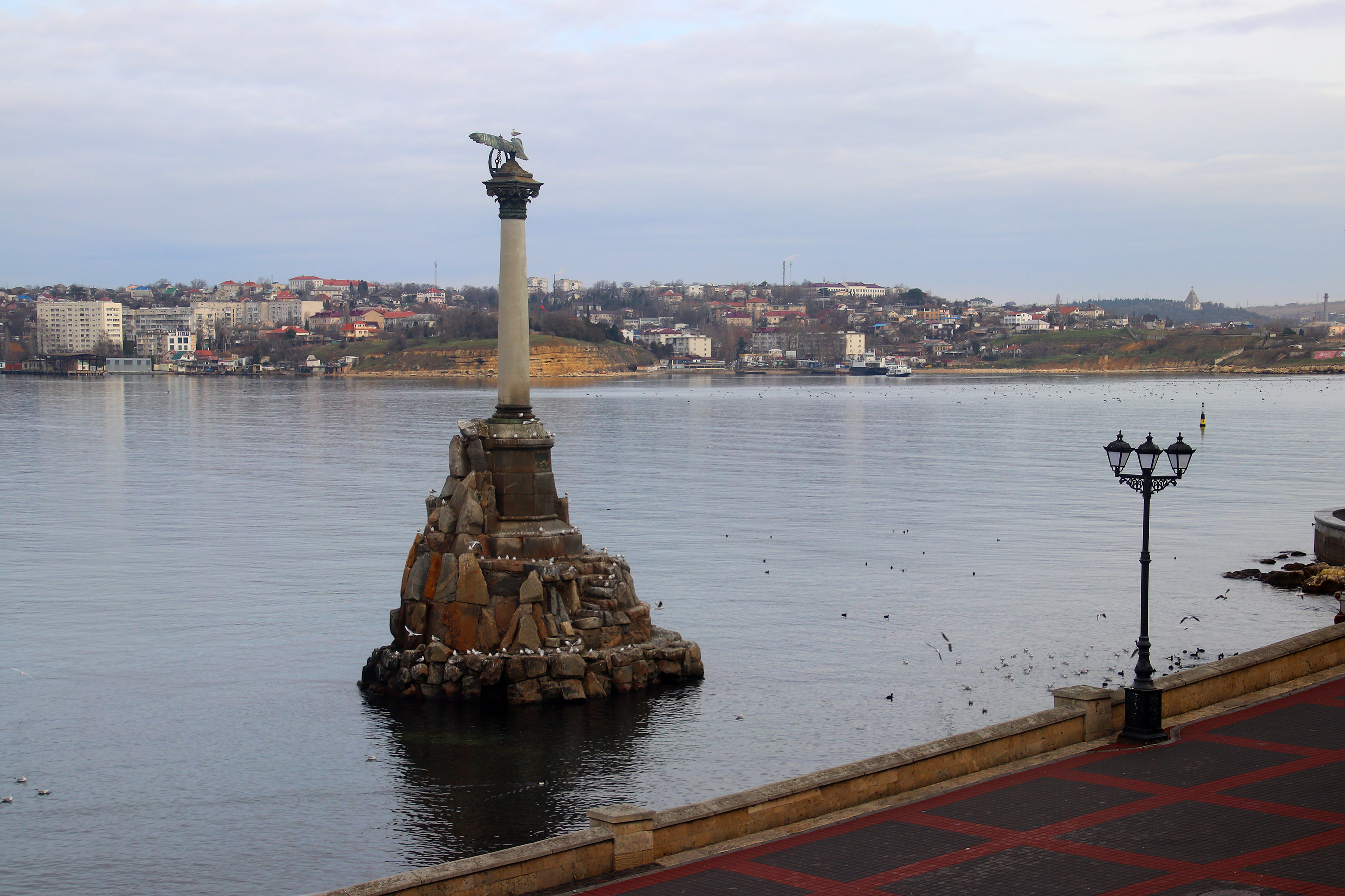 Памятник затопленным кораблям и январская набережная в Севастополе