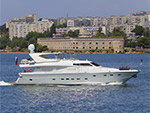 это стеклопластиковая яхта с флайбриджем длиной 23,9 м и осадкой 2,2 м, которая