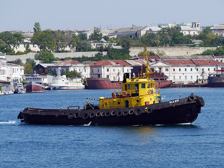 Буксир "Маяк" на фоне Корабельной стороны Севастополя