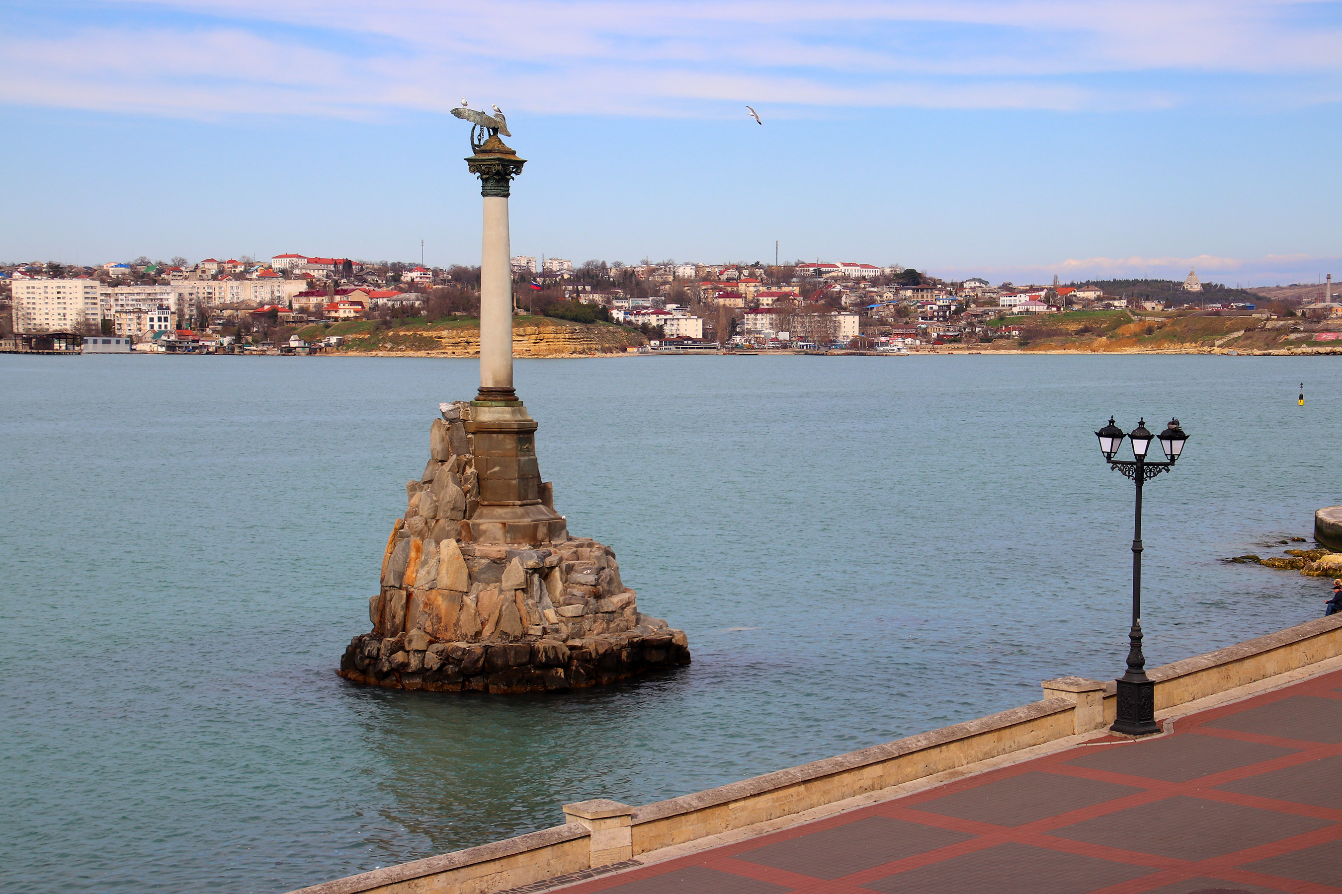 Памятник затопленным кораблям и Северная сторона Севастополя в марте месяце