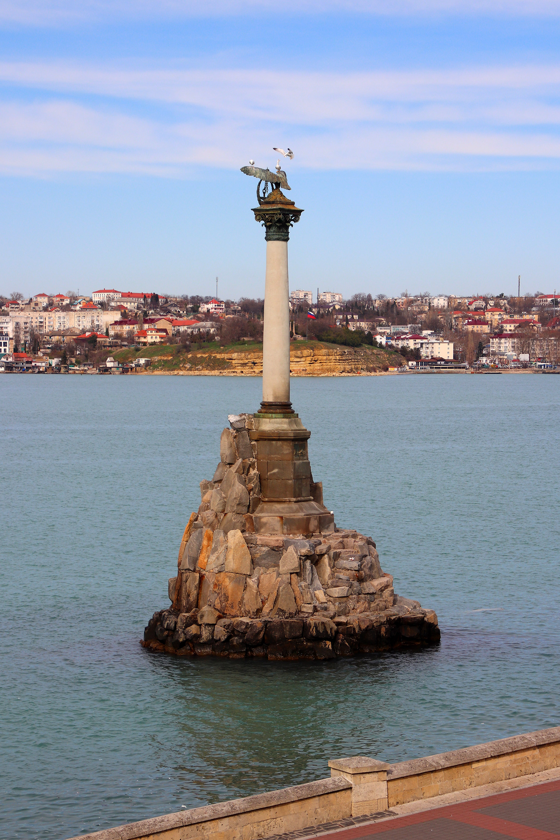Памятник затопленным кораблям и Северная сторона Севастополя за ним - вертикальное расположение кадра