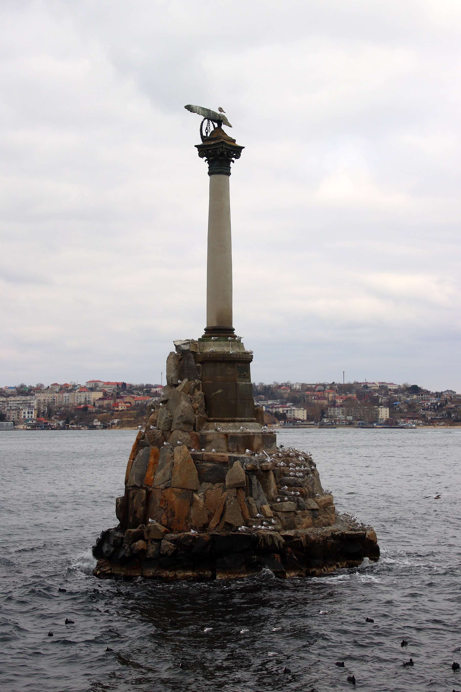 Памятник затопленным кораблям - вертикальный кадр - пасмурный мартовский день